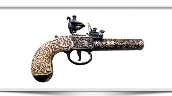 La pistola de bolsillo diseñada por Kumbley y Brum en Londres en 1795, Sin duda merece nuestra atención por los increíbles detalles. Fabricada en metal y cachas de plástico imitación marfil, con mecanismo simulador de carga y disparo.