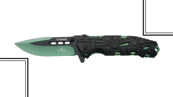 Navaja asistida de la marca Third modelo Yankee mango de alumino negro con agujeros hoja de acero inox de 10.5 cm negra con el corte anodizado en verde liners anodizados en verde. Con funda con clip