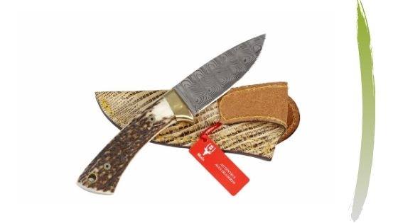 El Modelo de lujo Colibrí Damasco, hoja de 7 cm de acero damasco inoxidable, cachas de asta de ciervo y latón.