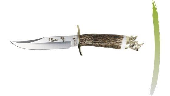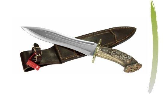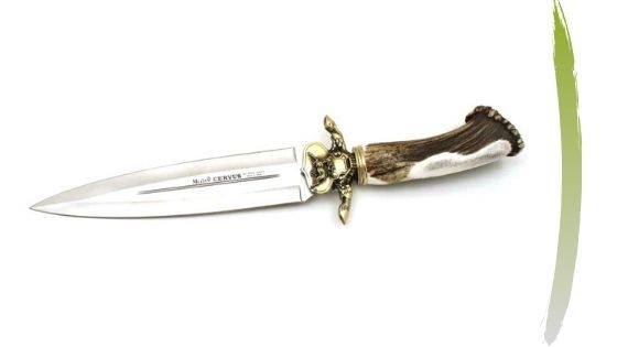 Modelo cuchillo de lujo de la marca Muela, modelo Cervus, empuñadura en asta de ciervo, guarda en latón fundido, acabado a mano.
