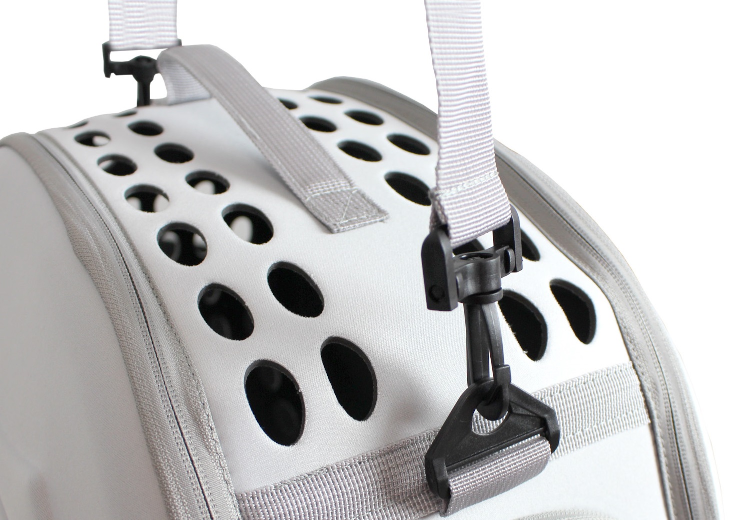 Este transportin posee unos prácticos soportes y viene con una pequeña correa incluida la cual podemos usar para ponerle una asa que podemos utilizar para colgarnos al hombro, y convertir este transportin para perros y gatos en un pequeño bolso de transporte de animales, lo cual es ideal para los viajes y también para los paseos con nuestra mascota
